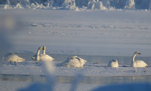«Спят на льду, засунув головы под крыло»: в Ковдорском округе пережидают зиму десятки лебедей-кликунов