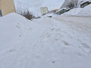 «Сани катятся в овраг»: на улице Видяева в Полярном при чистке дороги засыпали тротуар