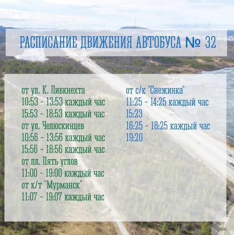 С 1 июня в Мурманске запустят автобусный маршрут №32, который будет курсировать до спорткомплекса «Снежинка». Это сделано для того, чтобы горожанам было удобнее добираться до КП-2.