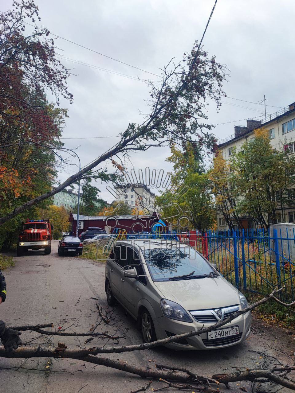 Чрезвычайное происшествие произошло сегодня во дворе тринадцатого дома по улице Чумбарова-Лучинского в Мурманске. На припаркованную там легковушку упала рябина. Еще одна не достигла земли, повиснув на проводах.