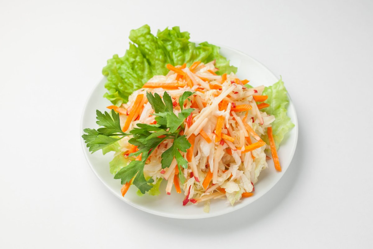 Эта закуска предназначена для тех, кто не фанат салатов на основе сметаны или майонеза, а предпочитает более привычные сочетания — острые и пикантные салаты.