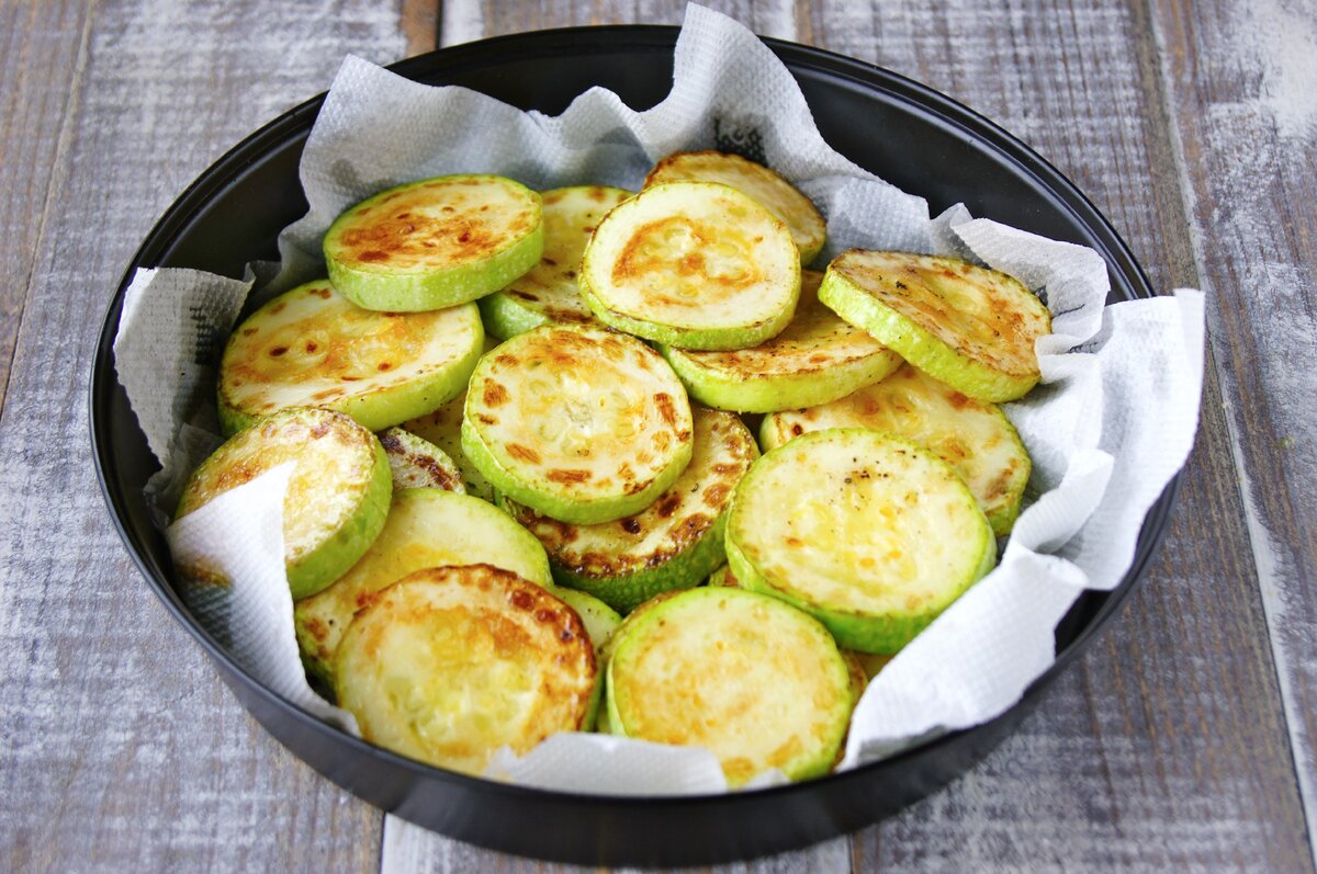 Нарезаем кабачки кольцами. Если плоды очень сочные, можно слегка посолить их и оставить на бумажном полотенце, чтобы избавиться от лишнего сока.