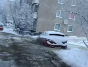 «Как их теперь вызволять – непонятно»: в Мурманске машины прочно вмерзли в лед из-за подтопления двора