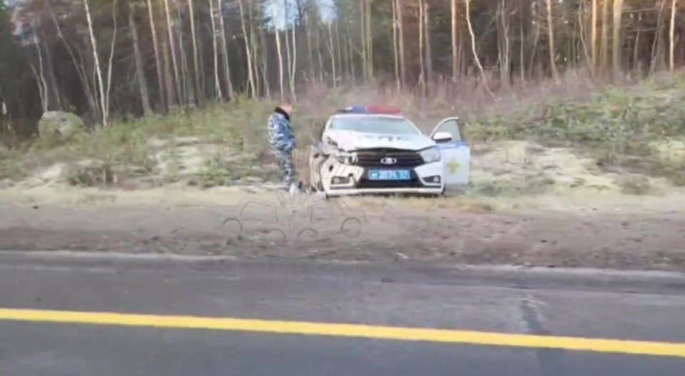 Видео с места ДТП попало в интернет. Участницей аварии стала машина ГАИ. Она выехала в кювет. У автомобиля разбит капот. На противоположной части дороги стоит «буханка», которая врезалась в ограждение.