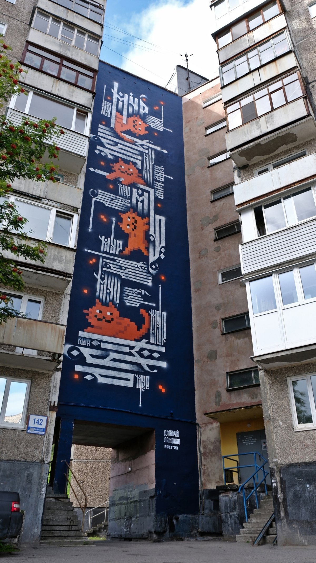 Здание находится в Мурманске на Кольском проспекте. Мурал создан в прошлом году и называется «Мур-мур». Его автор — Дмитрий Лимонов. Шрифтовая композиция состоит из повторяющегося слова «Мур», написанного современной вязью.