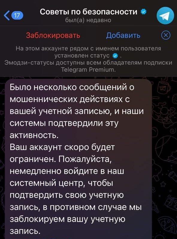 Далее мошенники рассказывают о системе, фиксирующей мошеннические действия с аккаунтом пользователя. Мол, вскоре человека могут заблокировать в Телеграм.