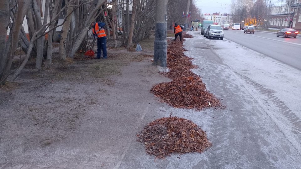 Сегодня в Мурманске побелели улицы — начался снегопад. Коммунальщики продолжают убирать город от опавших осенних листьев. Больше всего их скапливается на газонах.