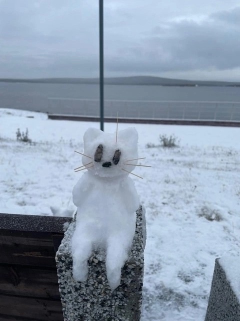Местные жители слепили из снежной массы фигурки котят. Одну из них поместили на скамейку. Глаза котовика сделаны из маленьких камней, а усы – из осенней травы.