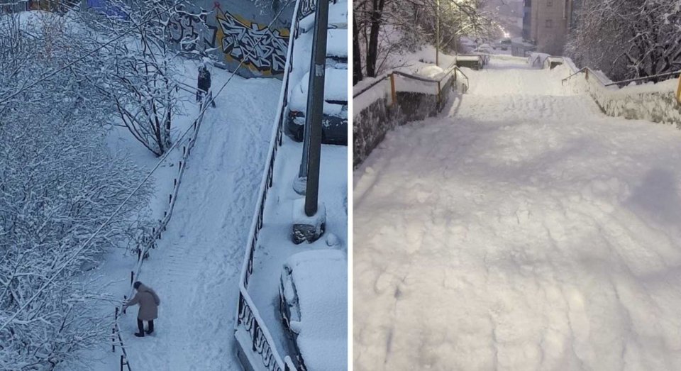 — С начала зимы не чистятся от слова совсем три больших лестницы с огромным потоком пешеходов около к/т «Мурманск». Каждое утро люди идут на работу, в школу, в детсад по скользким, травмоопасным с налипшим снегом лестницам. Ступенек уже не видно — всё превратилось в снежную горку, — написал мурманчанин Константин Ширков.