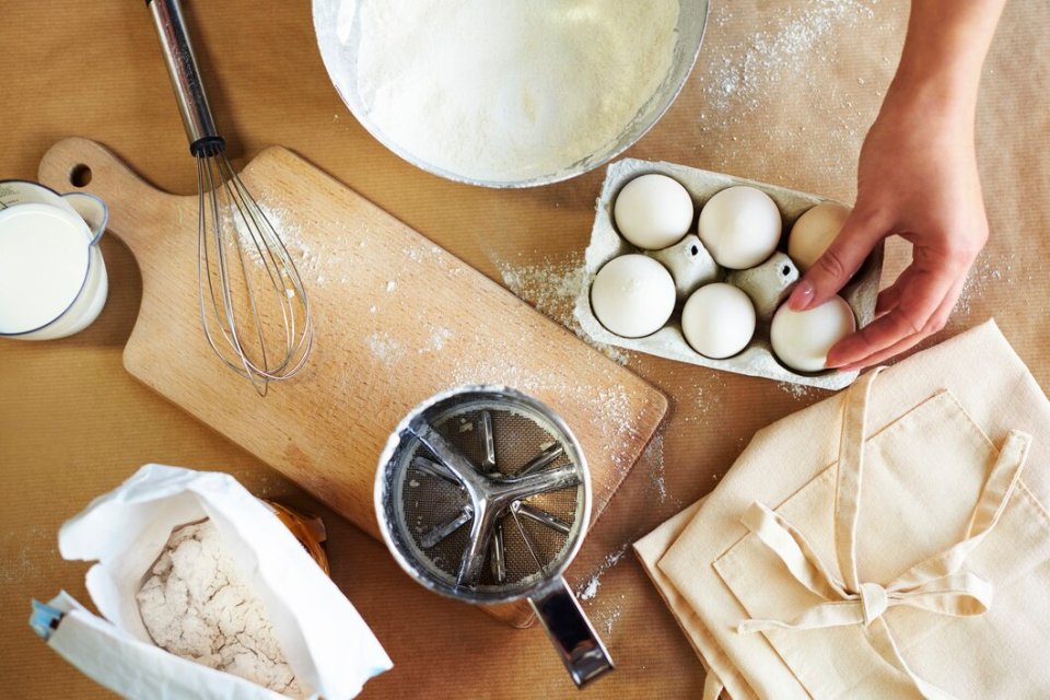 Затем всыпьте просеянную пшеничную муку высшего сорта и разрыхлитель. Аккуратно вмешайте ее венчиком, но не взбивайте. На этом этапе можно добавить различные приправы, пряности.