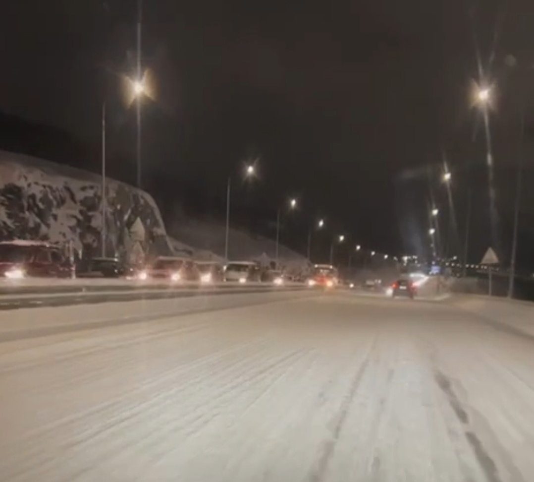 Проезжая часть сузилась, автомобили снижали скорость. Как сообщается в соцсетях, фуры не могут подняться в гору. Больше грузы шлифуют колесами и буксуют. В результате этого образовалась большая пробка в сторону Североморска.