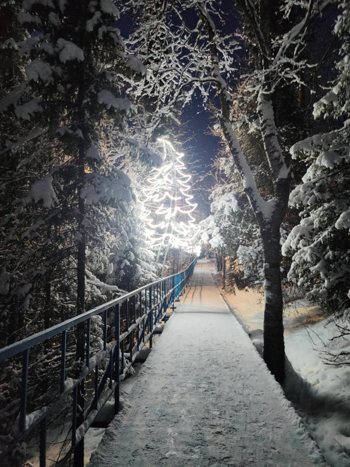 В Умбе примерно год назад появились красивые световые конструкции. Они сделаны в виде елей. Установлены вдоль дороги и деревянных помостов. По этой пешеходной тропе часто ходят местные жители. Это украшение — подарок от музея-заповедника «Петроглифы Канозера».