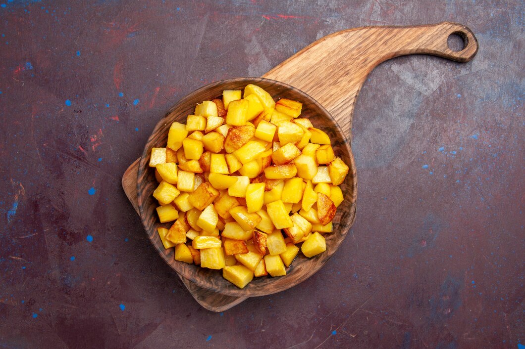 Сначала надо очистить картофель, затем надо измельчить овощи средними кубиками. Перед выкладыванием на противень, кусочки надо промокнуть бумажным полотенцем.