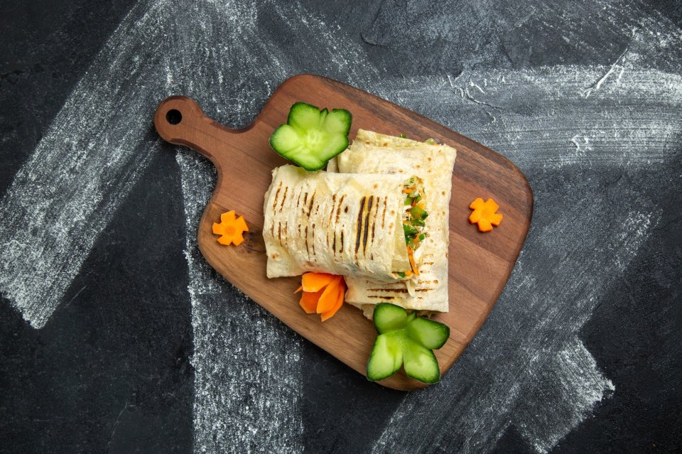 Пока лаваш с фаршем обжаривается, займитесь подготовкой начинки. Нарежьте тонкими кусочками помидор, маринованный огурчик и соус. Для соуса смешайте кетчуп с майонезом, половину чайной ложки горчицы и добавьте чуточку рассола от огурцов.