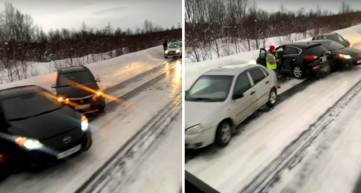 — Дорога каток! Неподалеку от Печенги на трассе Р21 «Кола» массовое ДТП. По словам водителей, поначалу было только две машины. Сейчас уже шесть. Движение транспорта временно ограничено, — уточнили в паблике.