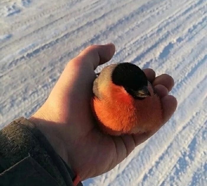 Маленького снегиря, прилетевшего в Апатиты, удалось сфотографировать северянину. Фотографию красногрудого красавца, удобно расположившегося на ладони у жителя Заполярья, опубликовали в сообществе «Мончегорск».