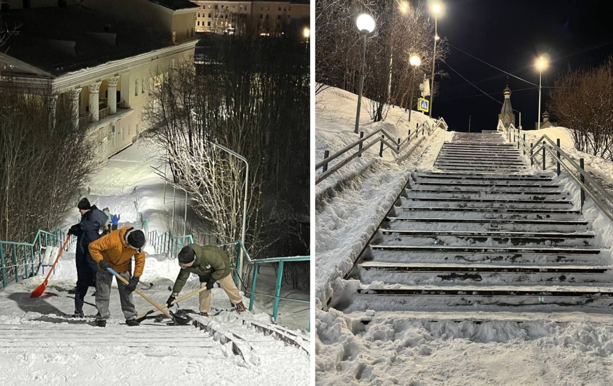 Лестницы в Североморске очищают от снега в три смены, сообщил глава ЗАТО Владимир Евменьков.