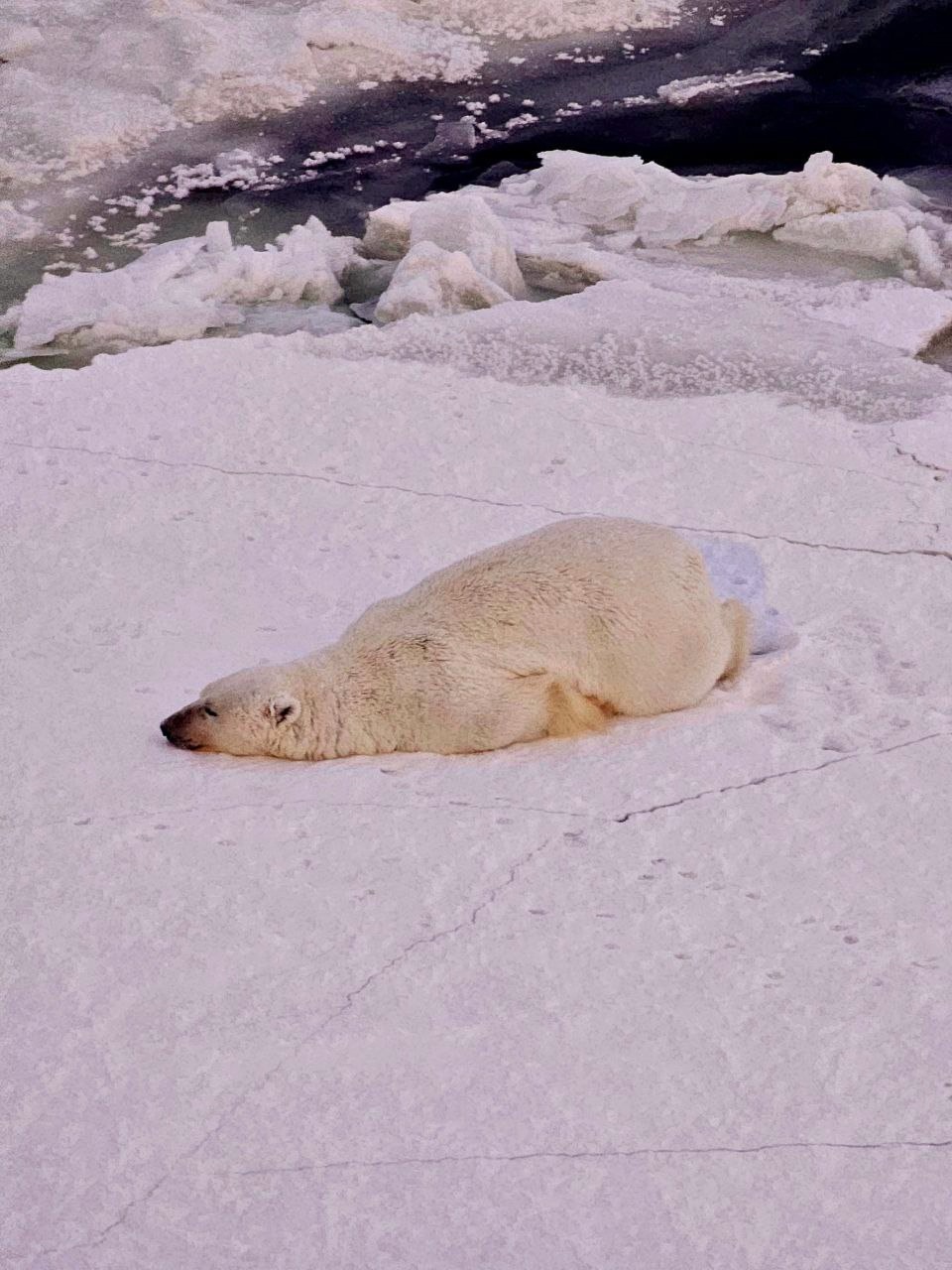 Медведь попал в камеру телефона старшего помощника капитана атомного ледокола «50 лет Победы» Владимира Павлова. Снимки получились забавными. На одно из них видно, как медведь вальяжно растянулся на льду, видимо, его раздосадовало, что ушел несолоно хлебавши.