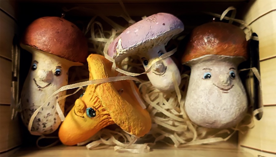 Фигурки мастер сделала сама. Они выполнены в виде подосиновика, белого гриба, волнушки и краснокнижной лисички. На ножке каждого гриба нарисованы глаза, есть нос и рот.
