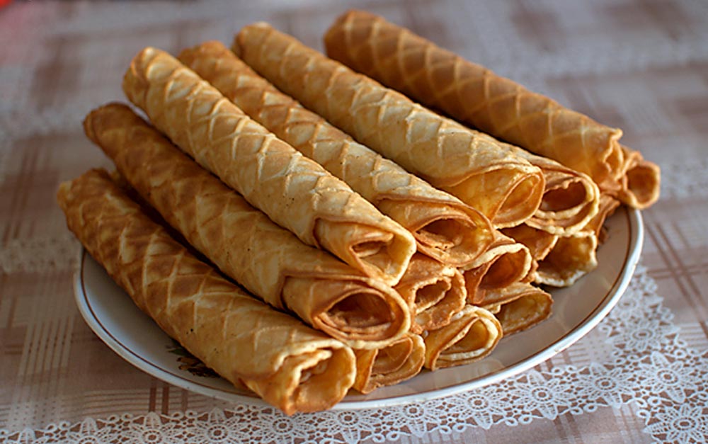 Трубочки со сгущенкой — возьмите 5 яиц и хорошенько взбейте их с 200 г сахара и щепоткой соли. Затем добавьте к яйцам 200-250 г мягкого сливочного масла, 250 г муки и снова взбейте. Такие вафли готовят в специальных вафельницах, а потом наполняют вареной сгущенкой.