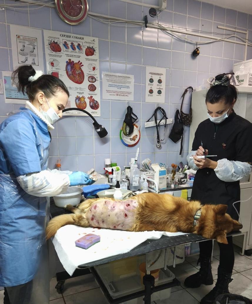 Прежде, чем хозяин успел вмешаться, безнадзорные животные нанесли множественные покусы, что привело к серьезному риску для здоровья собаки. Судя по фотографии, пострадавшая — карело-финская лайка. Раненую отвезли в ветклинику, где специалисты оказали помощь. Отмечено, что если собаку искусали ее сородичи, необходимо показать ее ветеринару.