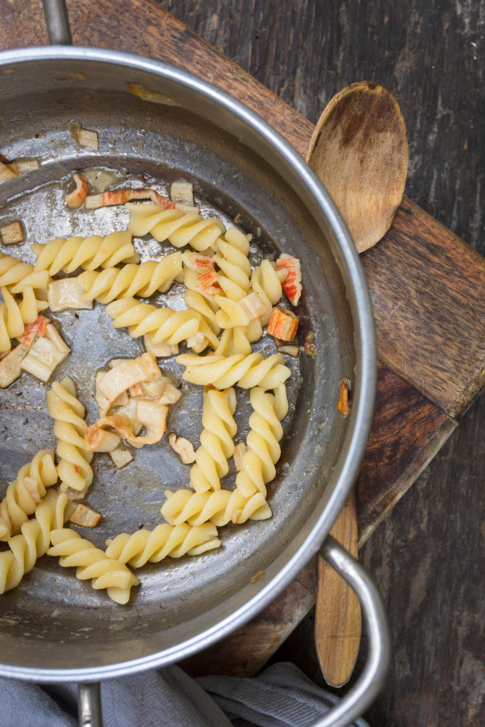 Добавляем соль ещё соли и ждём, когда в сковороде сварятся макароны (8-10 минут).
