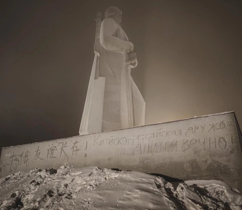В Мурманске на стене у мемориала защитникам Советского Заполярья в годы Великой Отечественной войны 1941–1945 годов северяне заметили китайские иероглифы и лозунг: «Китайско-российская дружба длится вечно». Фотографию надписи на заснеженной поверхности монумента опубликовали в паблике «Мурманск ДТП-ЧП».