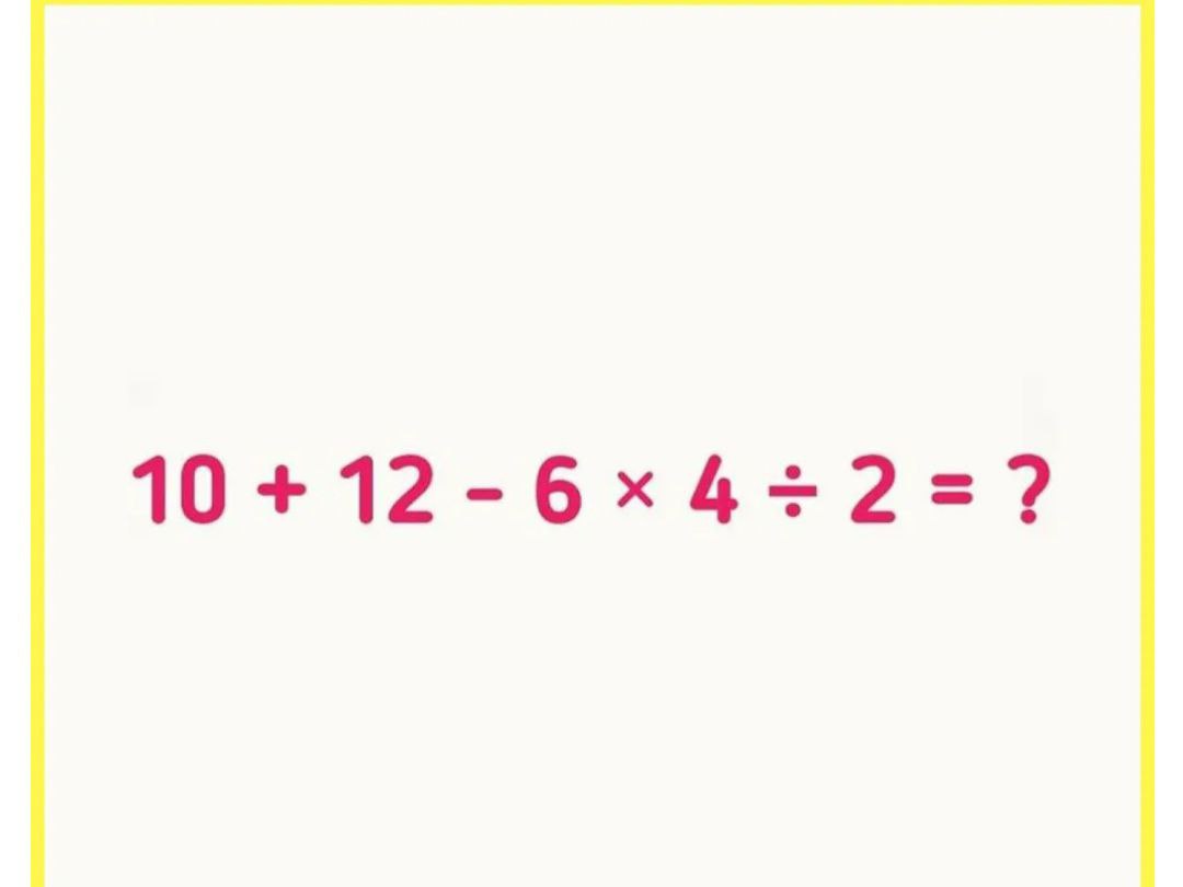 Как известно, первым в примерах нужно проводить умножение и деление: 6×4 = 24. 24 теперь делим на 2 и получаем 12. А дальше все слева направо: 10 + 12 — 12 = 10.