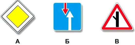Преимущество при проезде нерегулируемых перекрестков предоставляют знаки, обозначающие главную дорогу: знаки «Главная дорога» (А) и «Примыкание второстепенной дороги» (В) (п. 1.2), термин «Главная дорога». Знак «Преимущество перед встречным движением» (Б) применяется на узких участках дорог, где затруднен встречный разъезд. Правильный ответ — 2.