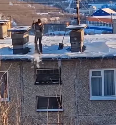 Такую картину из окон соседних зданий увидели местные жители. Мужчина забрался на крышу дома. С помощью лопаты счищал с кровли снег, а ломом откалывал с кромки лед. Все бы ничего, но мужчина выполнял эти работы без какой-либо страховки.