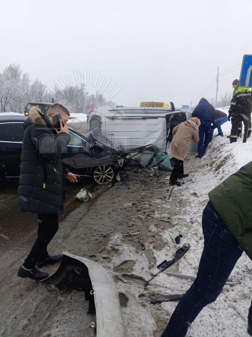 По предварительным данным, врезались друг в друга два автомобиля. На снимках видны последствия ДТП. Одну из машин вынесло на обочину, она перевернулась и капотом уткнулась в сугроб.