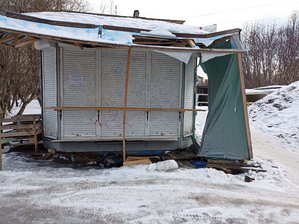 Жители Мурманска обратили внимание на старый торговый ларек на ул. Александра Невского, который портит внешний вид города. О полуразрушенном строении с натянутой сбоку тканью они рассказали на странице Андрея Чибиса в соцсетях.