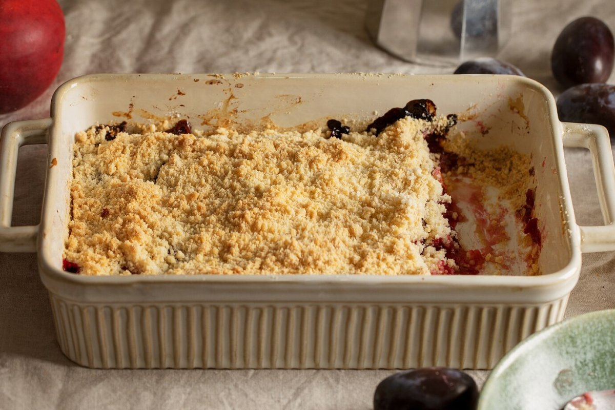 Собираем пирог — первым слоем выкладываем основу, затем кладем творожную начинку, сверху посыпаем крошкой. Выпекаем при 180 градусах примерно 50 минут.
