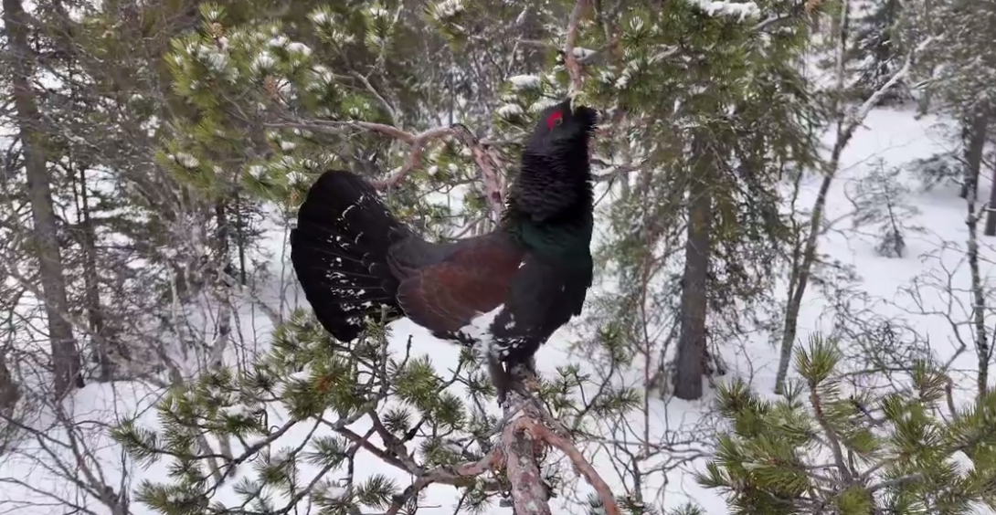 В Лапландском заповеднике на верхушке сосны глухарь позировал квадрокоптеру
