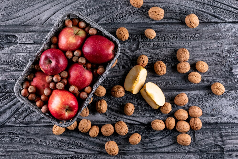 Крупное яблоко очистите и натрите на крупной терке, измельчите стакан грецких орехов и смешайте с 3-4 столовыми ложками сахара и щепоткой соли. Поставьте на медленный огонь и, помешивая, варите около 10 минут до загустения. В самом конце добавьте щепотку молотой корицы и остудите начинку.
