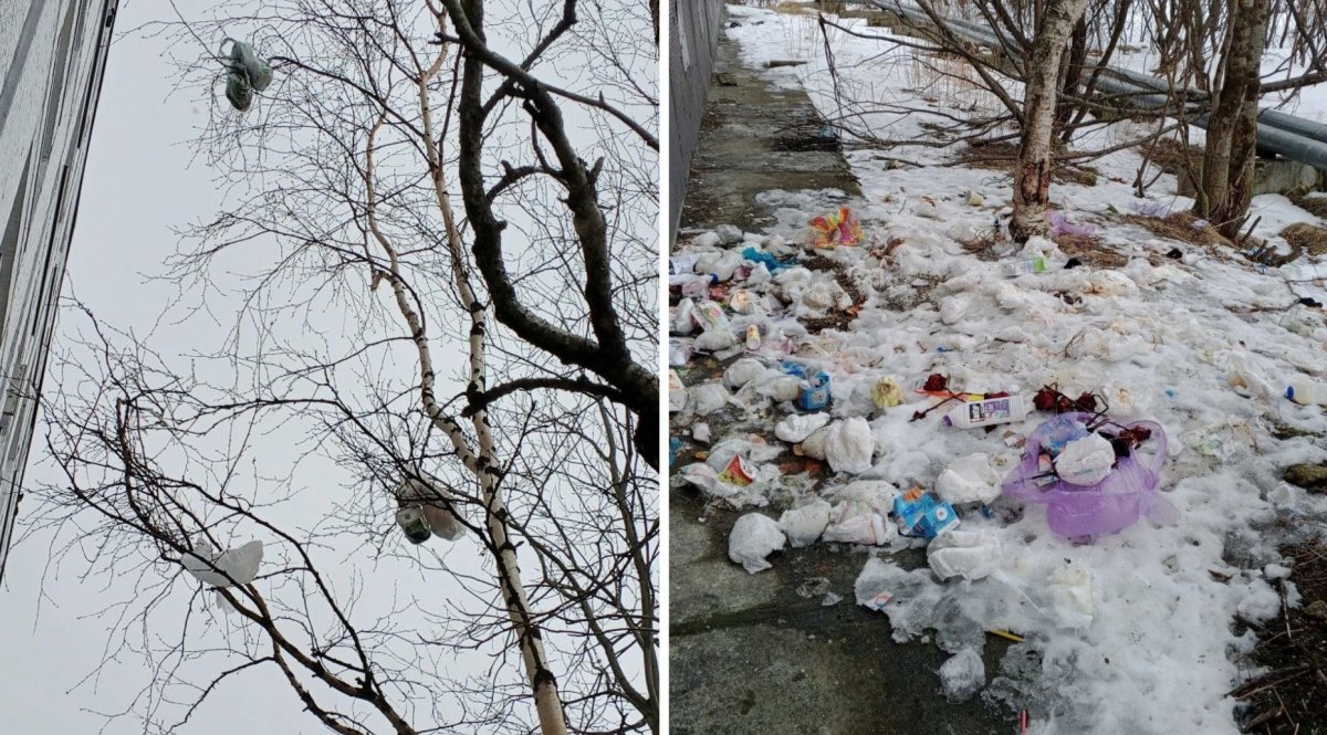 Груды отходов и пакеты на деревьях — жильцы дома в Видяево выбрасывают мусор прямо из окна