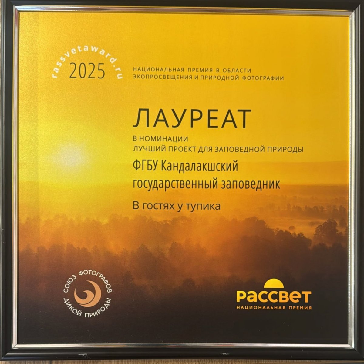 Кандалакшский заповедник стал лауреатом II Национальной премии в области экопросвещения и природной фотографии «Рассвет» в номинации «Лучший проект для заповедной природы». Об этом представители заповедной территории рассказали в соцсетях. Учреждение приняло участие в конкурсе с проектом «В гостях у тупика», представив фотоработы разных авторов и снимки с фотоловушек.