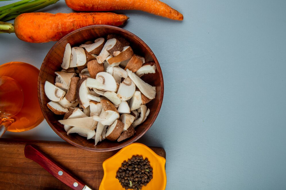 Для оригинального ужина понадобится килограмм картофеля, 1 морковка, 30 мл растительного масла, 300 г грибов, 50 г сметаны, 100 г сыра, соль и перец.