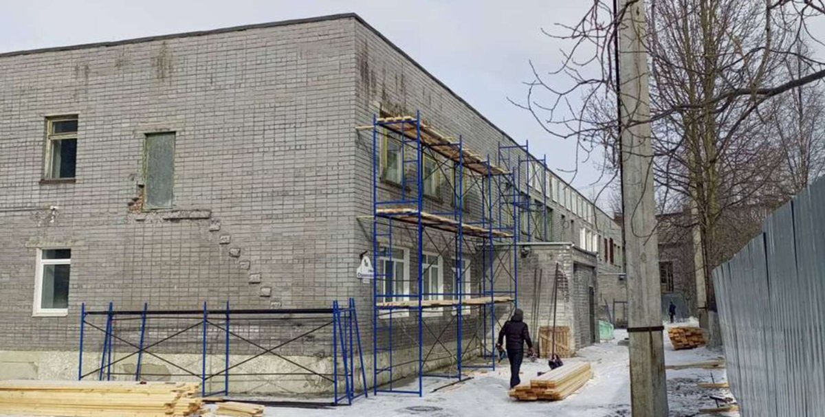 Сейчас в здании демонтируют старую отделку, инженерные сети, оборудования. Строители устанавливают леса для работ на фасаде.
