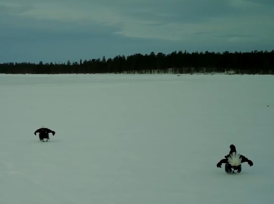 — Тетерева токуют энергичнее, демонстративнее и дольше, чем глухари. Песня их состоит из двух элементов: продолжительного «бормотания», напоминающего воркование, и короткого «чуфыканья». Первое время тетерева токуют на деревьях и только днем, позднее — на поверхности снега; петь начинают до восхода солнца, а позднее — с вечера, токуя всю ночь. В Лапландии токовища располагаются на льду озер или на обширных болотах, — объяснили специалисты заповедника.