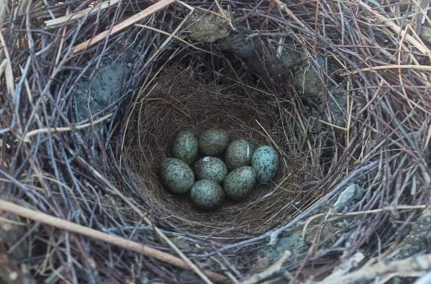 Внешне оно неказистое, так как птицы построили его из веток в виде неправильного шара. Верх — своего рода крыша из сучьев. Но внутри гнездо оказалось аккуратным. Там находилось 8 яиц.