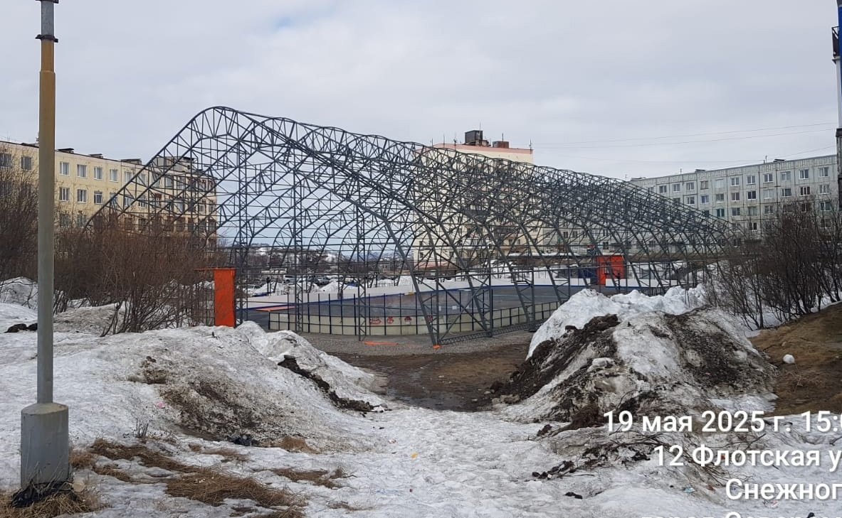 Крытый хоккейный корт «Апельсин» в Снежногорске продолжает стоять без тентового полотна. Об этом в соцсетях сообщили северяне.