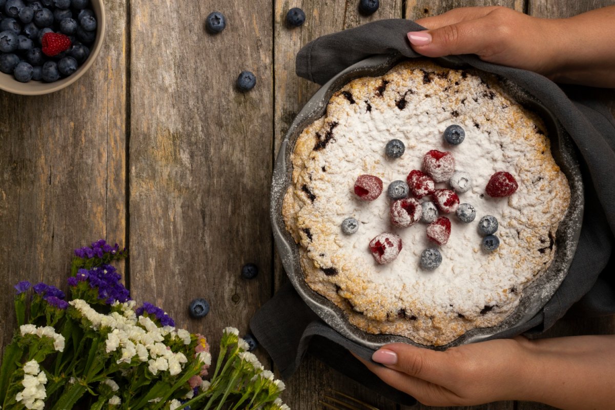 На противень размером 24Х30 см кладем бумагу для выпечки и сверху выливаем тесто, равномерно распределяя. Выпекаем в разогретой до 180 С духовке около 40-45 минут. Даем пирогу остыть и посыпаем сахарной пудрой.