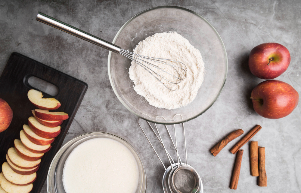 Возьмите 4-5 яблок и натрите на крупной терке прямо с кожурой. Сбрызните лимонным соком, чтобы они не потемнели и разделите на 3 равные части. Отмерьте по стакану муки, сахара и манной крупы и смешайте все сыпучие с 1,5 чайными ложками разрыхлителя. Сухую смесь разделите на 4 части.