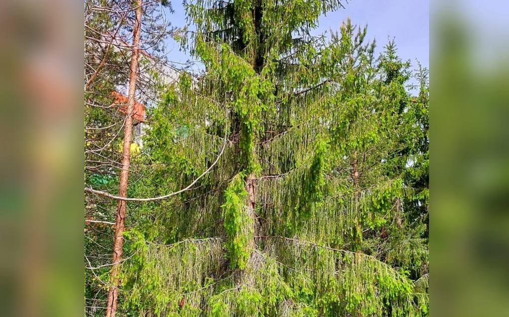 На фотографии, опубликованной в паблике, можно заметить, что ветви высокой ели по внешнему виду действительно напоминают плакучую иву. Они опущены вниз, кроме того, почему-то даже «растеряли» часть иголок.