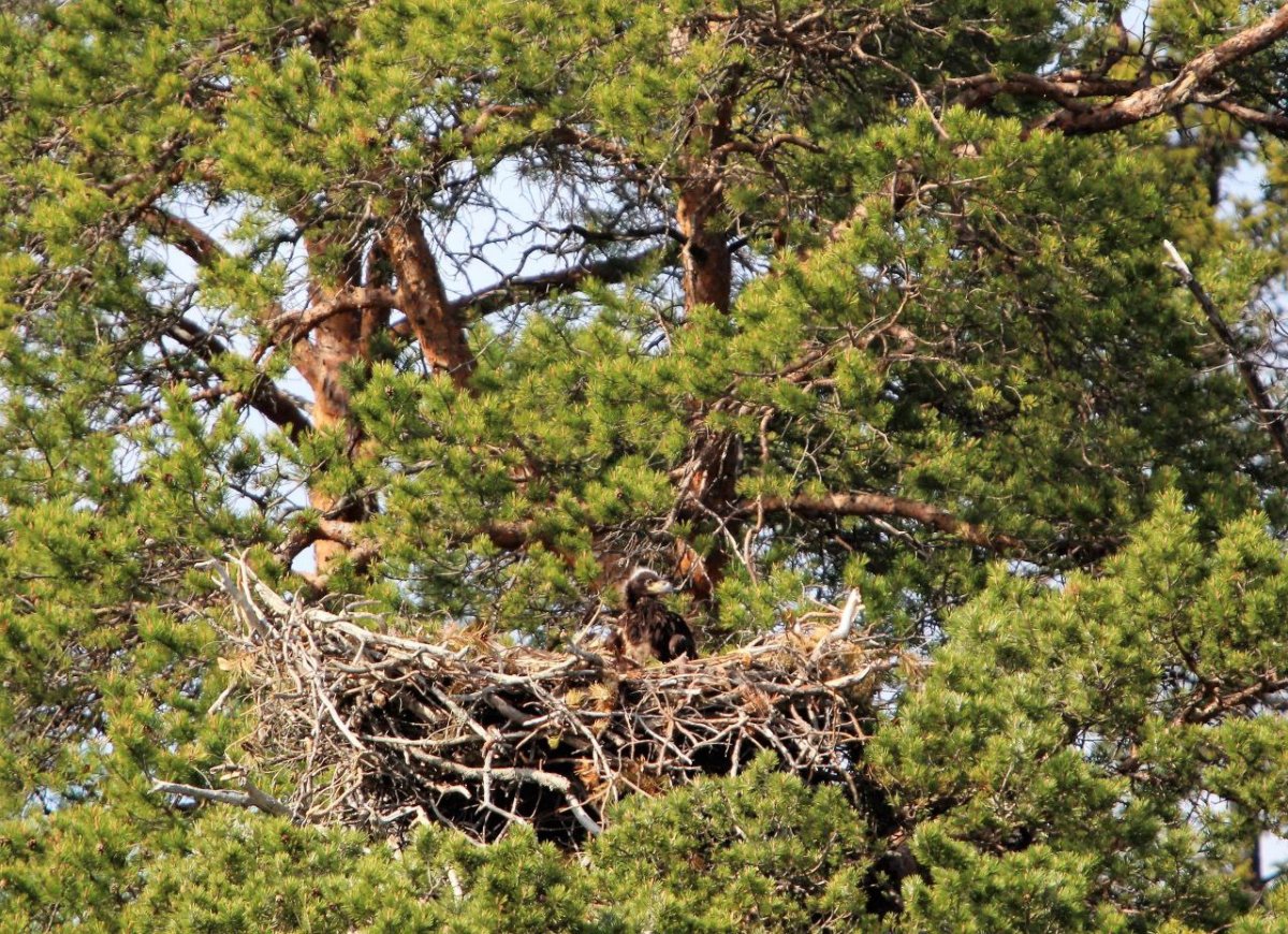 — Гнездо на старой сосне, неподалеку от морского берега. Рыба — наиболее желанная их пища. В гнезде можно разглядеть птенца. Он уже сменил пух на птенцовый темный наряд, но до вылета из гнезда ещё далеко, — объяснил Василий Вощиков.