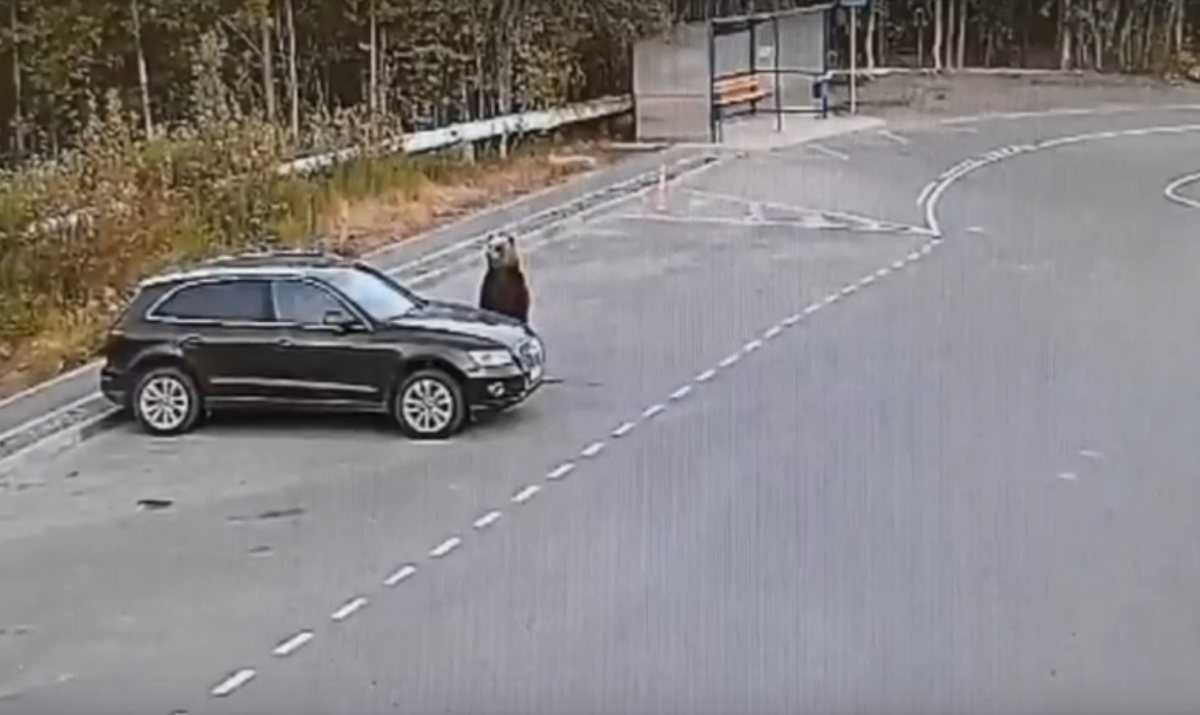 Судя по кадрам, хозяин леса прошелся по парковке и остановился возле одиноко стоящего автомобиля. Там медведь встал на задние лапы, словно примеряясь, подойдет ли ему этот транспорт.