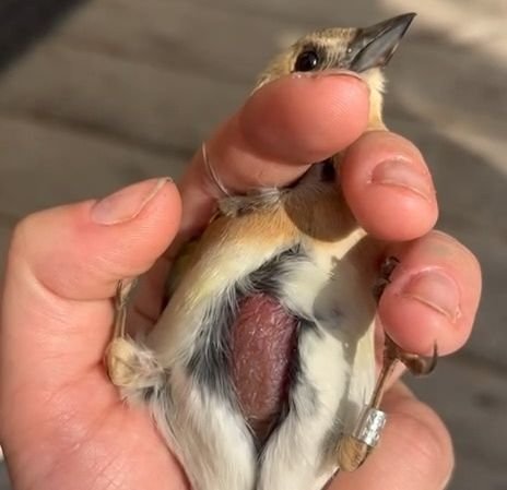 В группе заповедника «Пасвик» в соцсети опубликовали уникальный снимок. Орнитологи демонстрируют наседное пятно юрка. Птица находится в руке человека к верху брюшком. Наседное пятно находится как раз на этом месте.