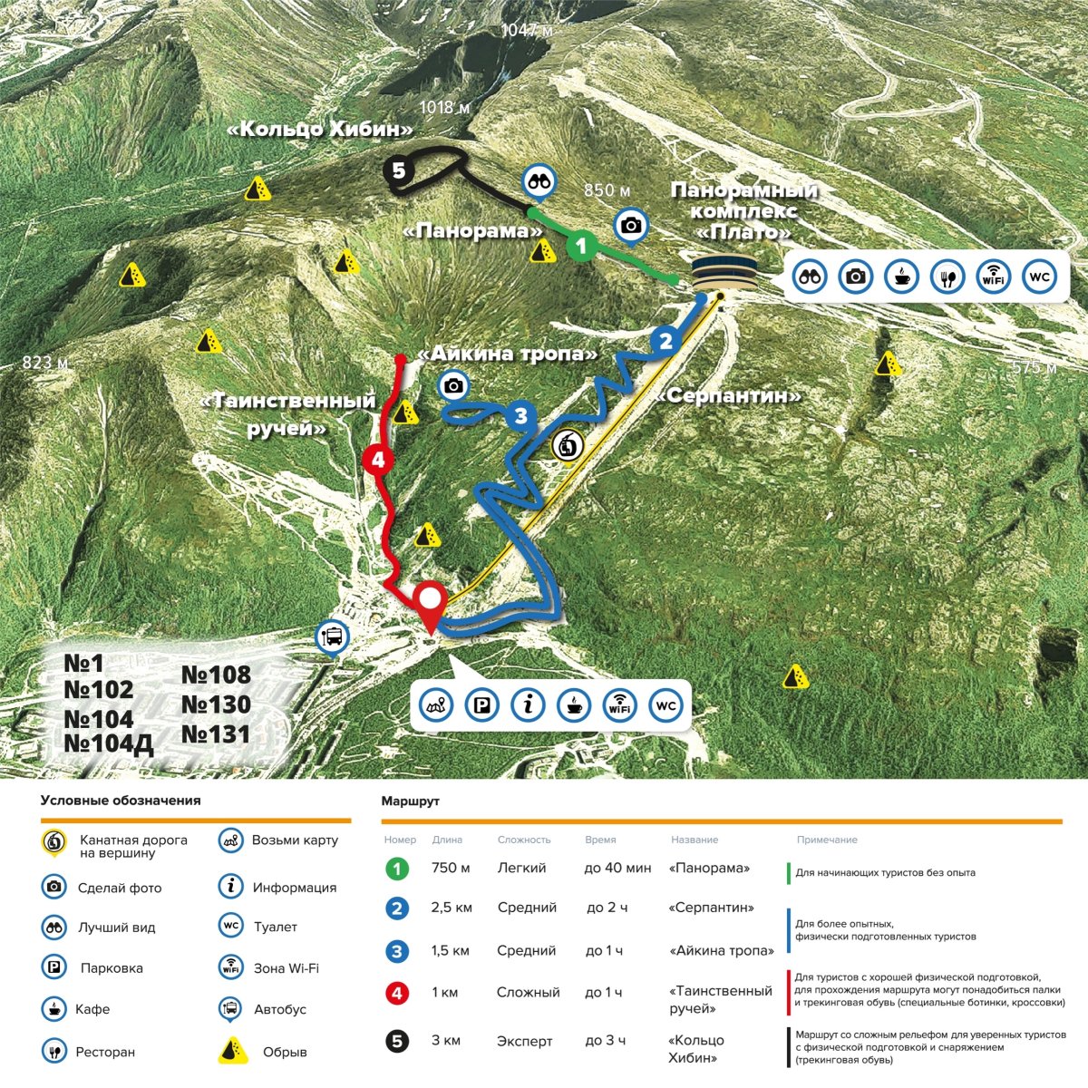 Еще один новый маршрут «БигВуда» — «Кольцо Хибин». Он начинается на вершине курорта, после тропы «Панорама». Маршрут со сложным рельефом проходит по горному хребту. Уровень «Эксперт». Подойдет для подготовленных туристов. Также потребуются треккинговые ботинки. Продолжают работу традиционные тропы «Панорама», «Айкина тропа» и «Серпантин».