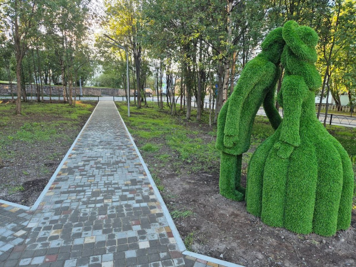 В Сиреневом сквере Оленегорска появились новые топиары. Одна из фигур выполнена в виде целующейся парочки. Топиары — декоративные скульптуры, которые создают из живых растений или искусственных. Оленегорские сделаны из искусственного газона.